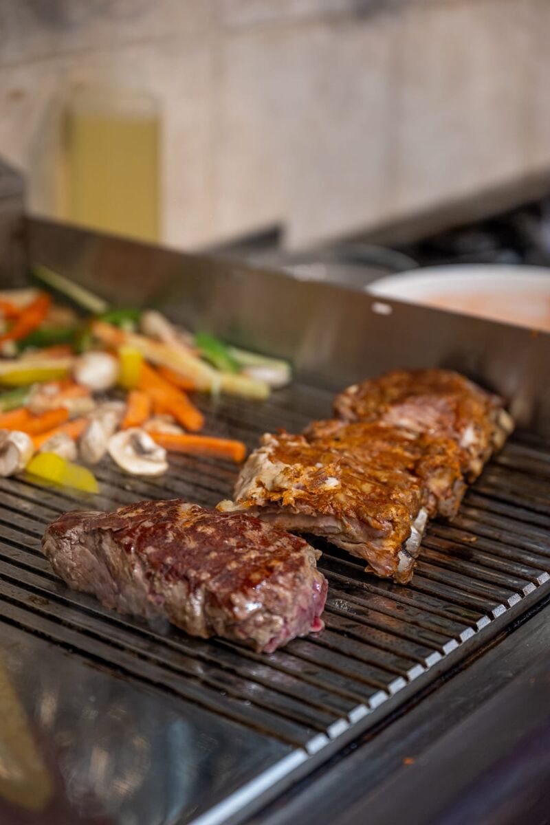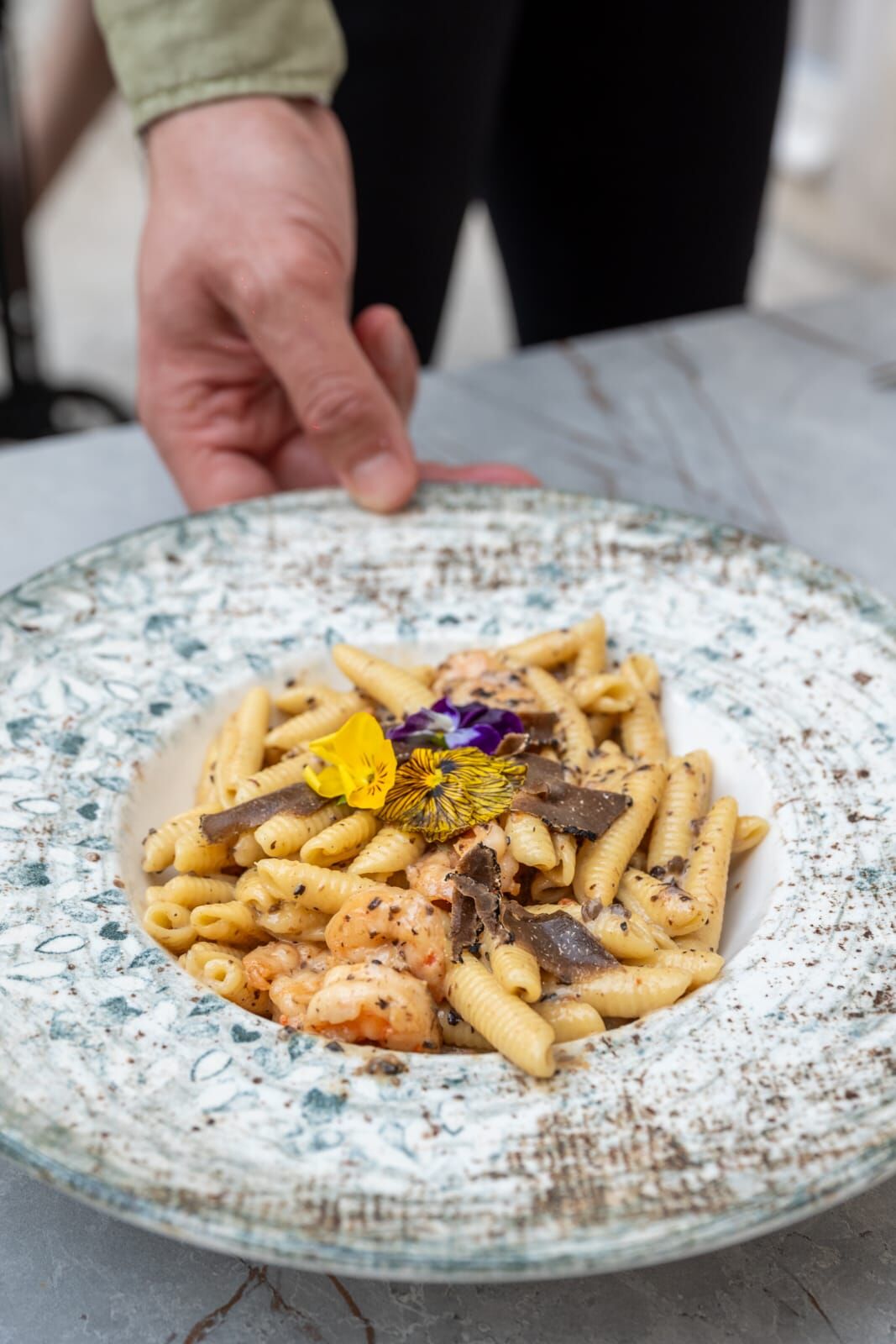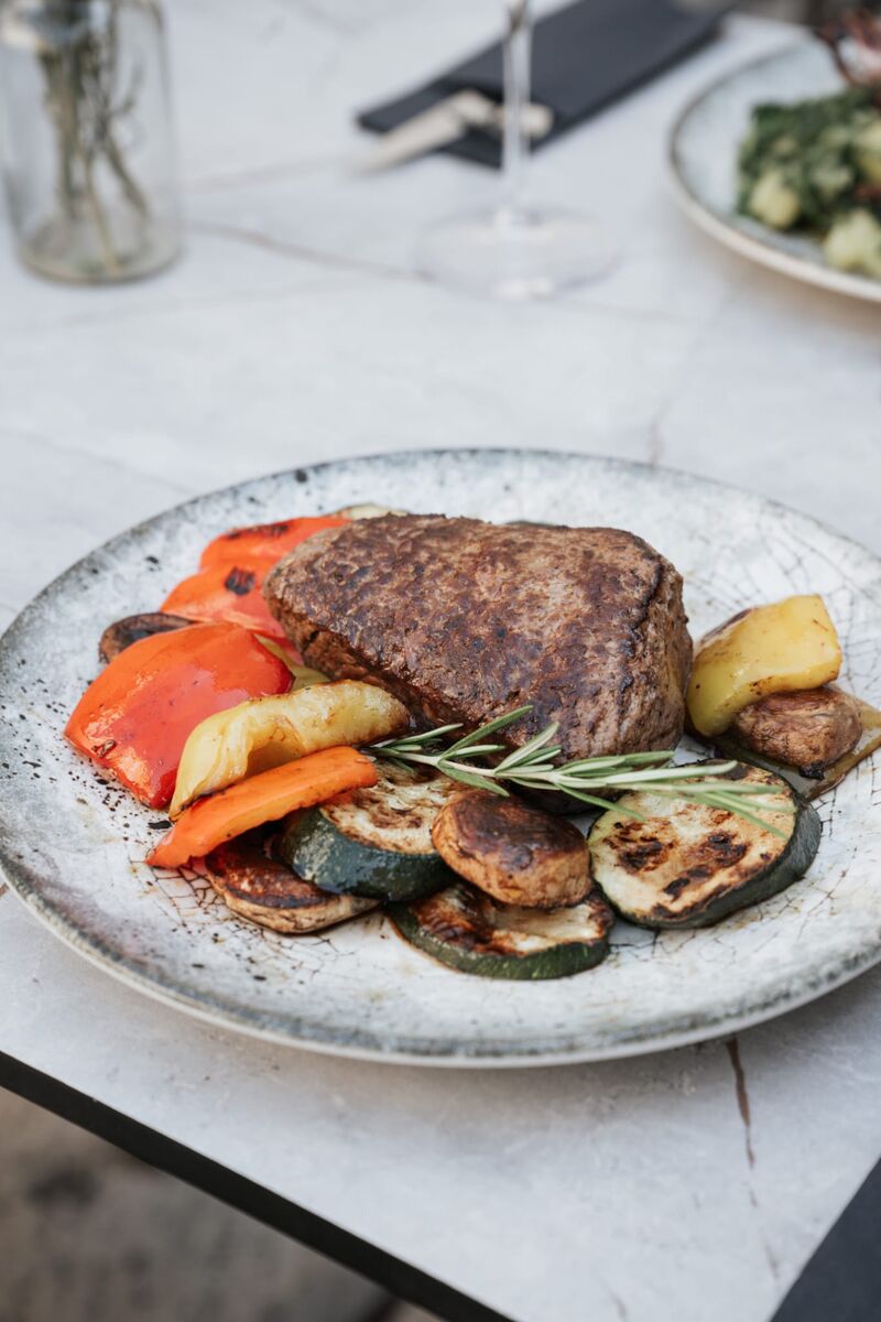 Meni nudi raznovrsna predjela poput zdravih salata,mesnih delikatesa,dimljene ribe, te bogat izbor glavnih jela uključujući biftek s umakom od tartufa, ribu pečenu u soli i janjetinu s ružmarinom, pašte i riže sa mesnim i ribljim specijalitetima.